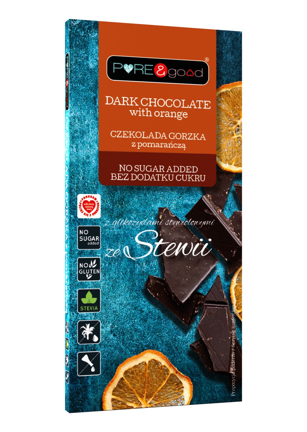 CZEKOLADA GORZKA Z POMARAŃCZĄ ZE STEWIĄ BEZ DODATKU CUKRÓW BEZGLUTENOWA 125 g – PURE&GOOD