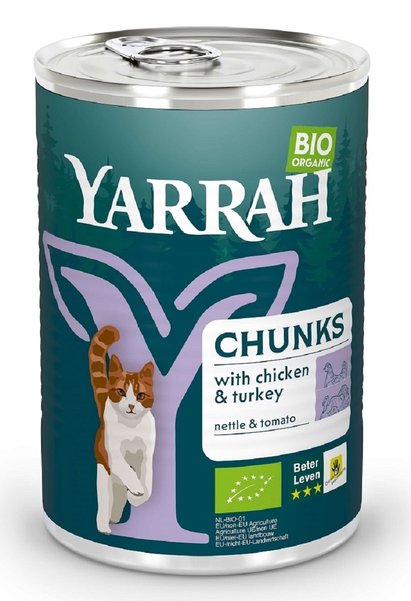 (DLA KOTA DOROSŁEGO) KAWAŁKI KURCZAKA I INDYKA Z POMIDOREM I POKRZYWĄ BIO 405 g – YARRAH