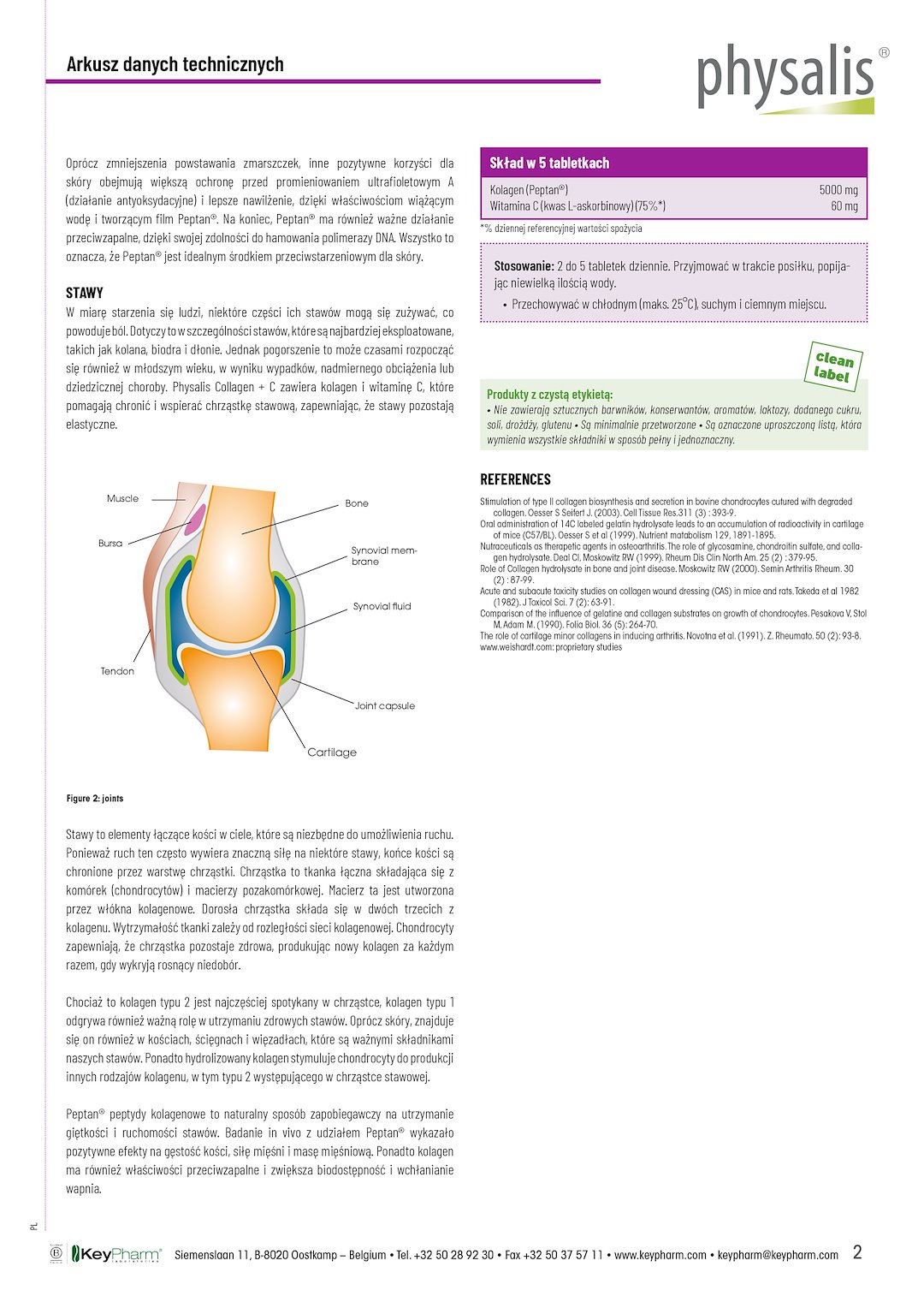 Physalis Kolagen + C to kompleks zawierający 1000 mg kolagenu w jednej tabletce. Kolagen to białko wchodzące w skład tkanki łącznej skóry, stawów, więzadeł, ścięgien i kości. Dodana witamina C pomaga w prawidłowym tworzeniu kolagenu, aby zachować zdrową skórę i chrząstkę stawową. Peptan® to wysoce czysta forma kolagenu typu I pozyskiwana z RYB, której działanie zostało potwierdzone różnymi badaniami klinicznymi. Jest wytwarzany w unikalnym procesie wykorzystującym hydrolizę enzymatyczną, w wyniku czego powstaje biodostępna mieszanina krótkich peptydów.