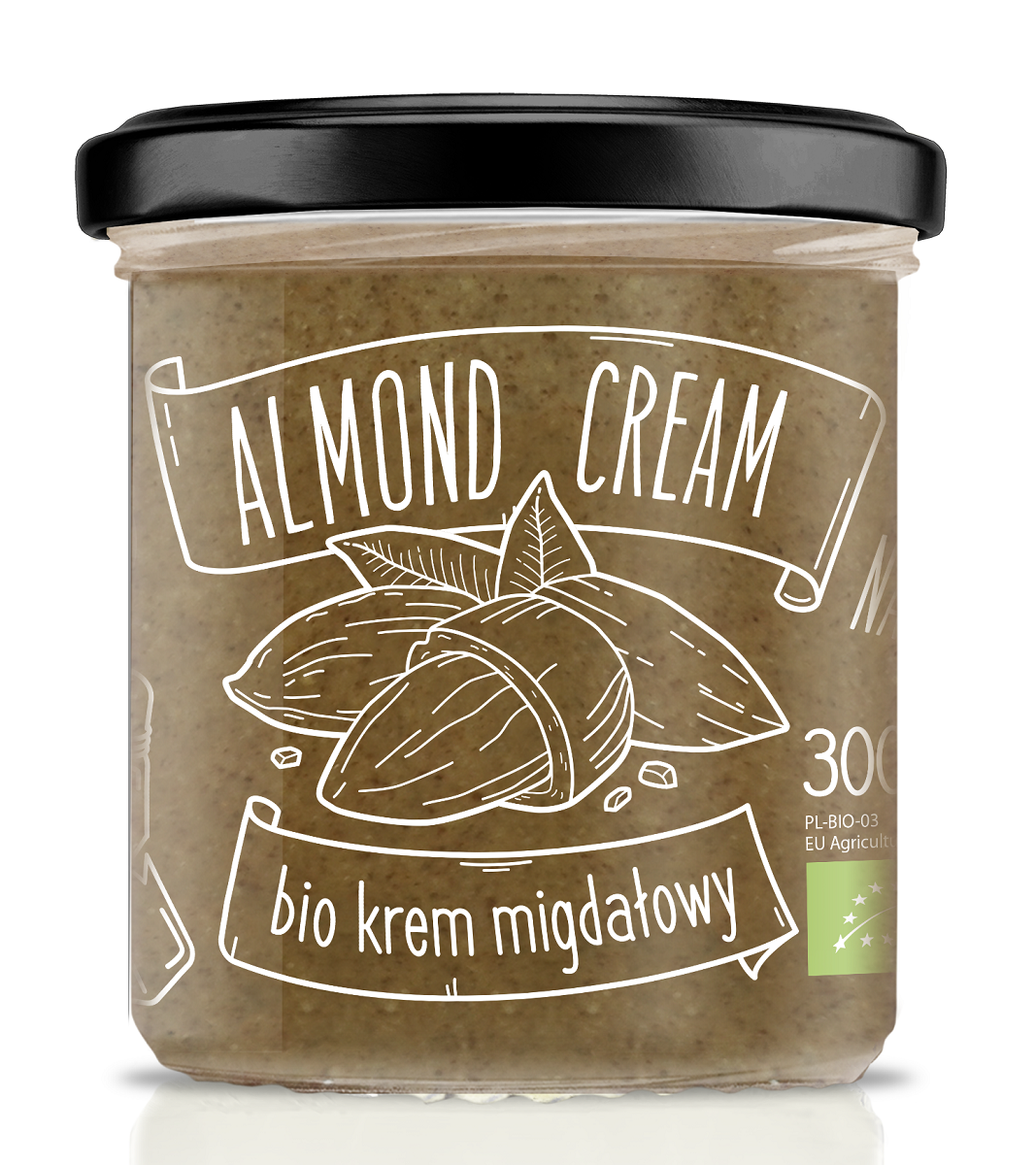 Naturalny, certyfikowany ekologicznie krem z naturalnych MIGDAŁÓW, bez żadnych dodatków, przygotowane jedynie z prażonych migdałów.