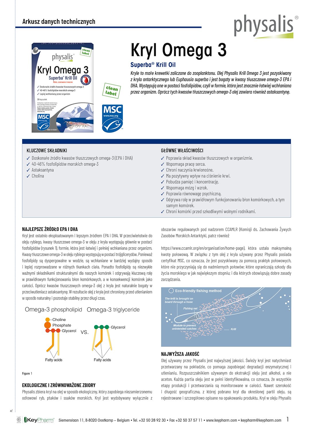lub Euphausia superba. Olej z kryla jest bogaty w kwasy tłuszczowe omega-3 EPA i DHA. Te kwasy tłuszczowe omega-3 w oleju z kryla występują w postaci fosfolipidów, czyli w formie, która jest znacznie łatwiej wchłaniana przez organizm. Oprócz kwasów tłuszczowych omega-3 olej zawiera także astaksantynę. Ekologicznie zbierane i złowione wyłącznie w strefach regulowanych. Przetwarzane w stanie świeżym, co pozwala uniknąć degradacji enzymatycznej i utleniania. W pełni identyfikowalne.