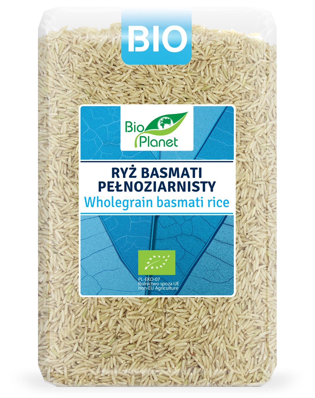 Ekologiczny ryż basmati pełnoziarnisty charakteryzuje się subtelnym orzechowym smakiem i niepowtarzalnym aromatem. Stanowi najszlachetniejszą odmianę ryżu na świecie. Doskonały jako dodatek do mięs, sałatek, dań egzotycznych i deserów.